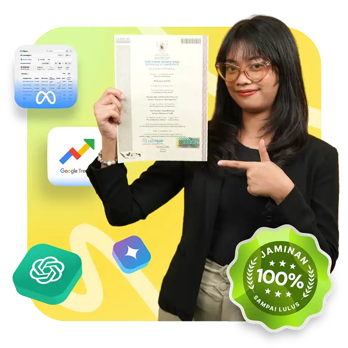 Dapatkan Pelatihan & Ujian Sertifikasi BNSP: Gratis ujian ulang sampai lulus! Pegang sertifikat resmi yang diakui perusahaan di seluruh Indonesia.