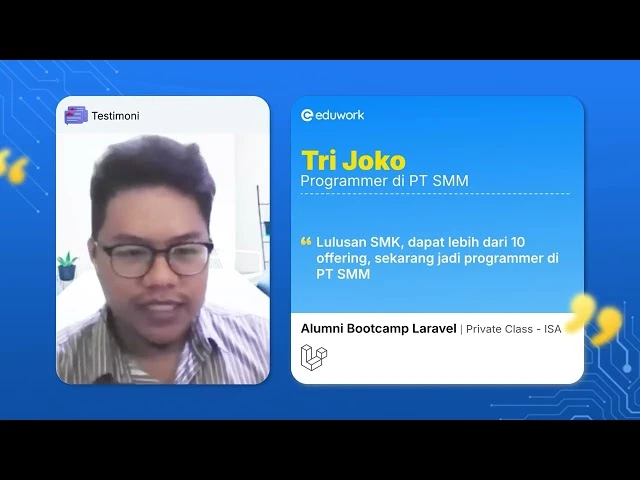 Saya mengikuti kelas Laravel dan Vue JS selama kurang lebih 4 bulan, selama belajar disini saya cukup puas dengan pembelajarannya. Kayanya kalau mater... Saya mengikuti kelas Laravel dan Vue JS selama kurang lebih 4 bulan, selama belajar disini saya cukup puas dengan pembelajarannya. Kayanya kalau materinya di tambah lagi akan semakin seru, biar saya sebagai alumni yang sudah tersalurkan juga masih bisa belajar hal baru dari materi eduwork.